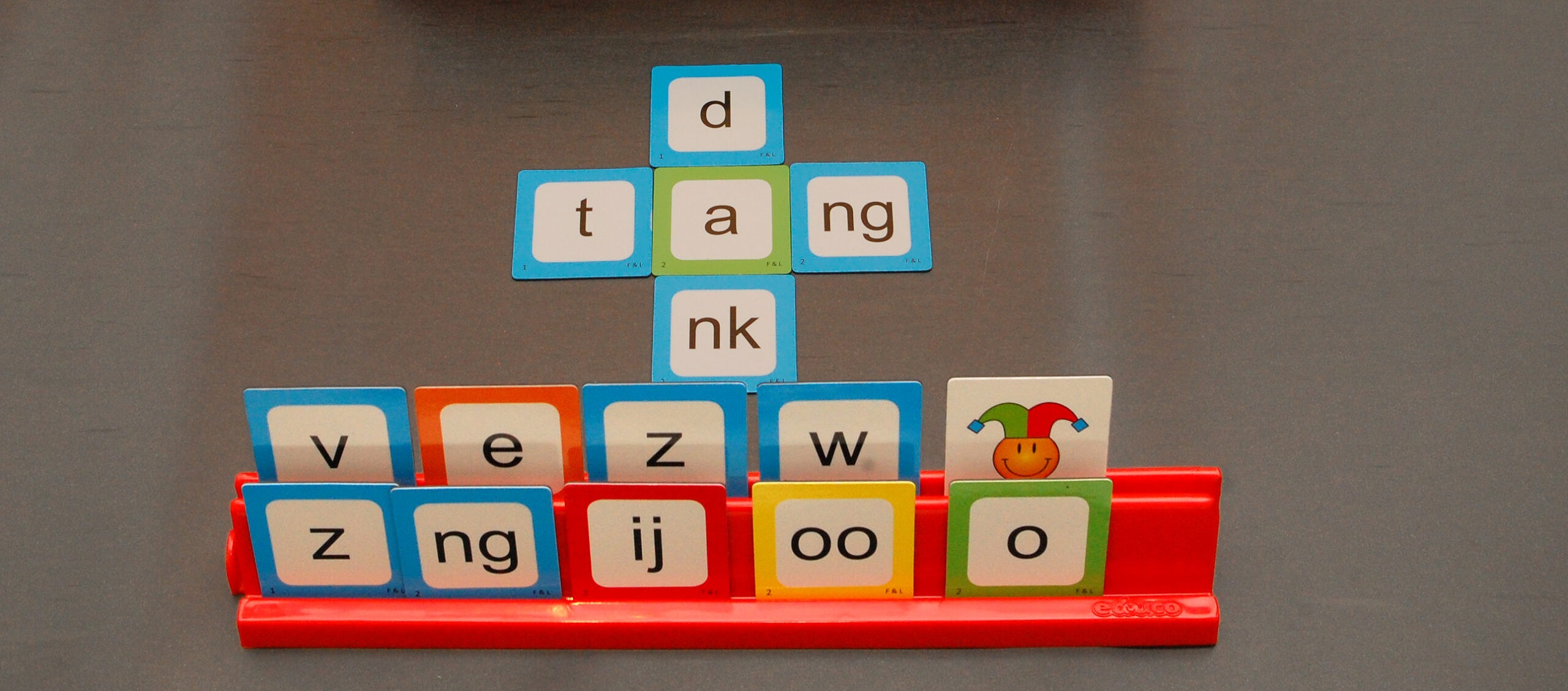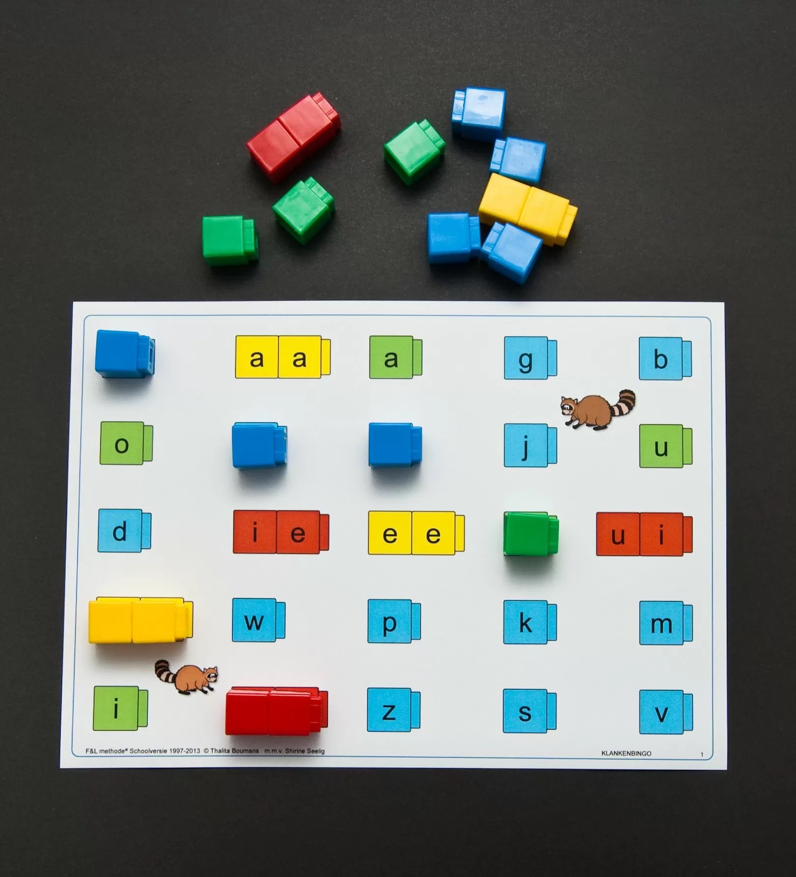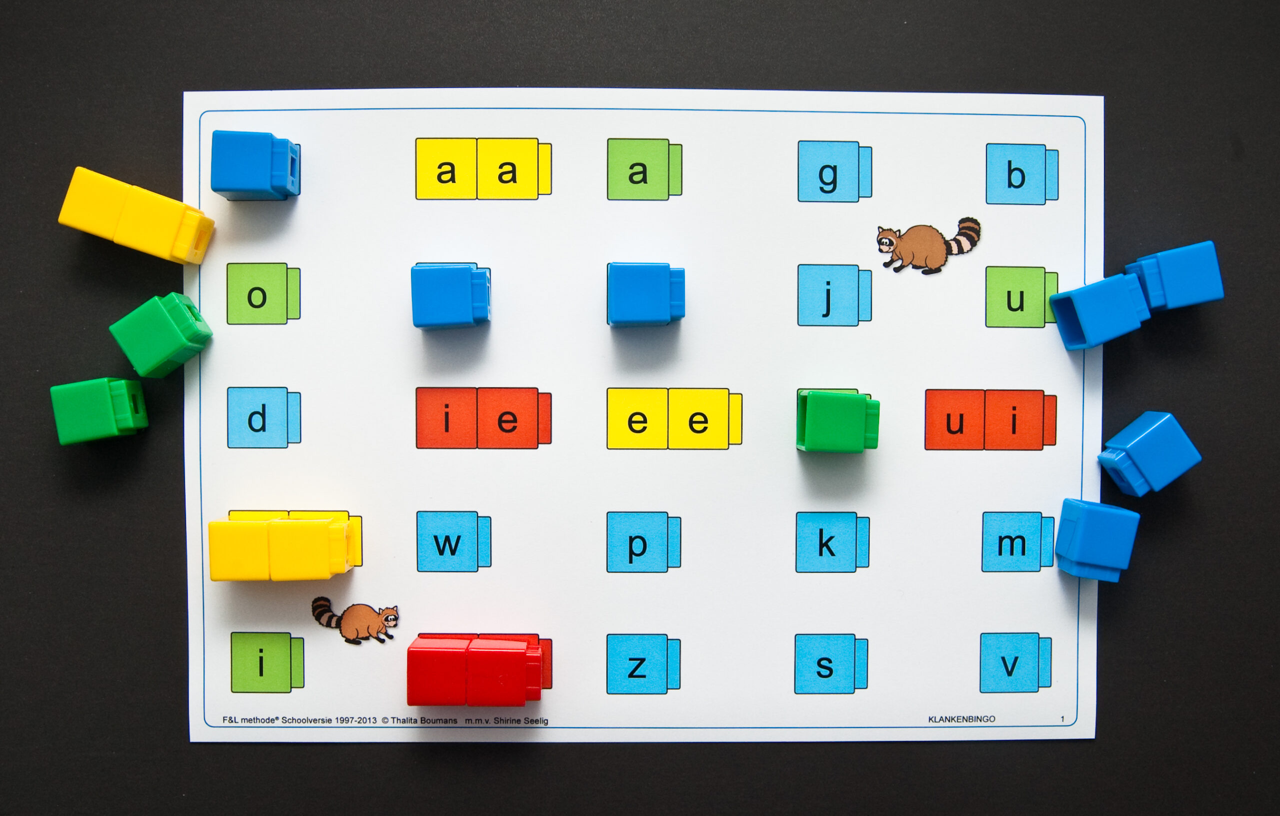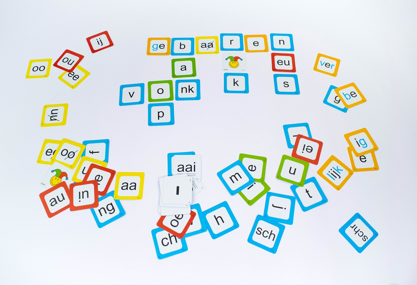 Er zijn kaartjes met klinkers, met medeklinkers, met stomme klinkers (stukjes), en kaartjes met de regel voor de lange klinker.